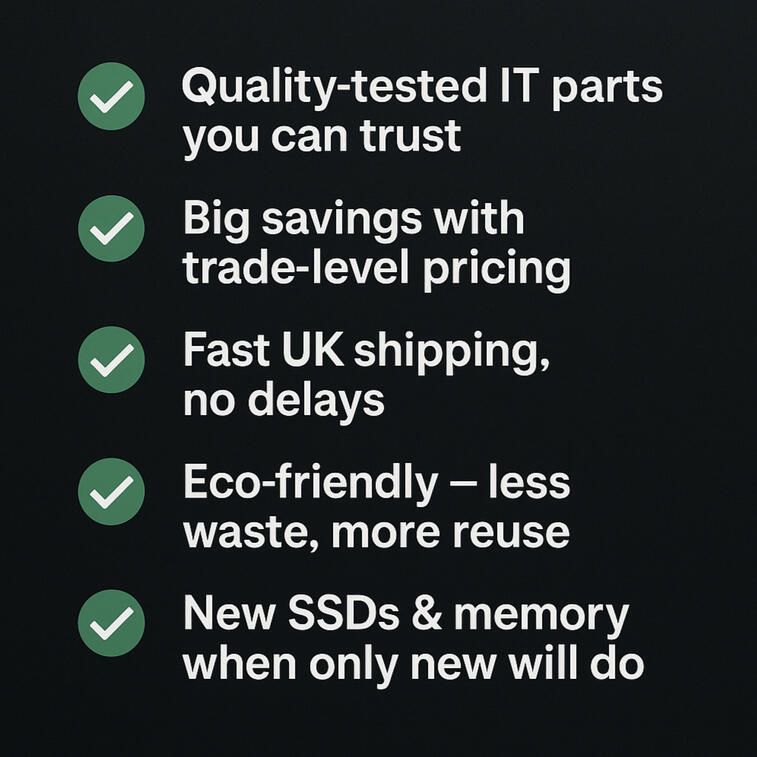 At OCS Components, we believe great tech shouldn’t cost the earth. That’s why we specialise in refurbishing quality IT parts — giving hardware a second life and helping to cut down on electronic waste. Every item we sell is tested, reliable, and ready to perform, while our customers enjoy the savings of trade-level pricing.When new components are the smarter choice — like SSDs and memory — we source them responsibly, so you get the best of both worlds: dependable performance and a lighter footprint on the planet.